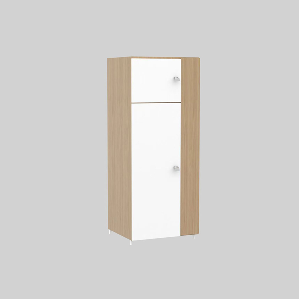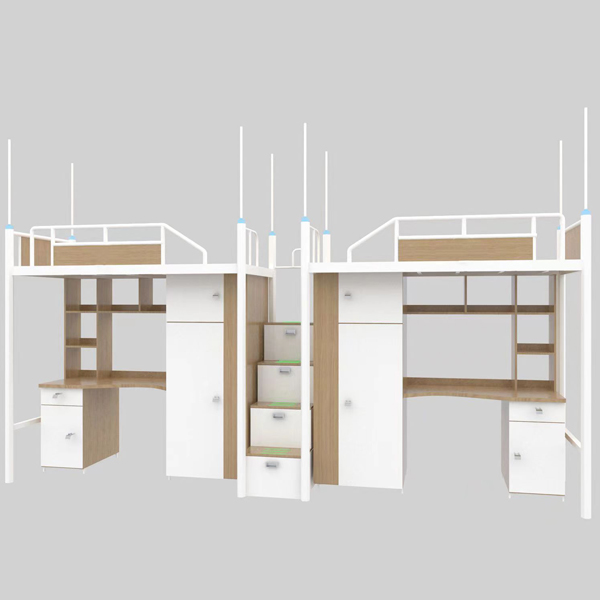 (3)床下衣柜规格: ≥W700mm*D600mm*H1700mm,采用≥18mm 厚度的 E1 级多 层实木板(杨树、桉树木芯)制作,背板采用≥5mm 厚度的 E1 级多层实木板(杨 树、桉树木芯)。衣柜内笼分上下两层,上层高 300mm,上层板下面安装不锈 钢挂衣杆,下层内部靠门板一侧配两个抽屉,规格均为: ≥长 350*高 225mm,抽屉内 置活动隔板,协助学生规范收纳。正面为固定板和门板,固定板为一块整板,门板分上下两块大小门设计,靠近中间走梯/爬梯为固定板,左右对称摆放。