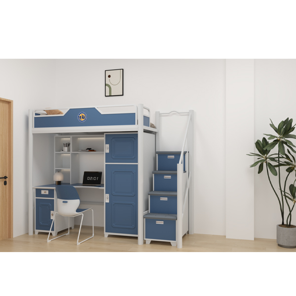 单人位连体公寓床(含铁床架、床板、钢制步梯及蚊帐架):L2650×W940×H2200mm(±3mm)