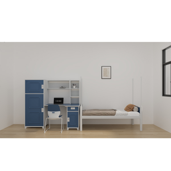 4.3二门衣柜:整体基材需采用全钢结构,背板需采用≥0.5mm,其余全部需采用≥0.6mm 冷轧钢板。喷塑后达到背板≥0.6mm,其他全部≥0.7mm 厚。塑粉经过静电喷涂,具有抗冲击、耐老化、耐磨,保证 15 年不变色等性能。柜门需采用明锁暗挂。二人位门框为梯形门框,增加内部使用空间,每块门内侧增加1个≥300×80×50(mm)储物盒设计和制作,可放置学生随身小物品。